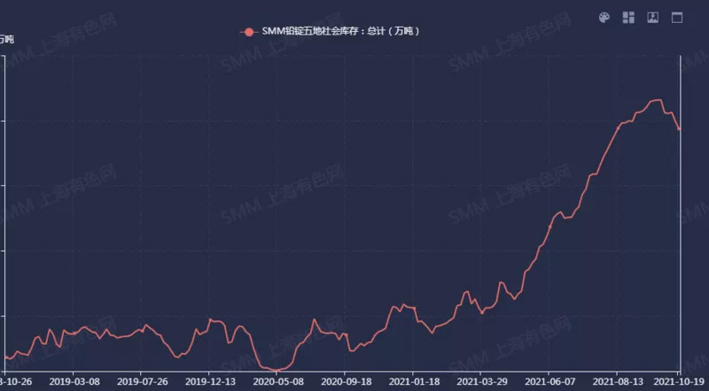 庫存方面,據SMM數據顯示,自4月底以來,國內鉛錠庫存便一直處于持續累庫階段,接連刷新自2014年以來的歷史高位。但國慶節前在虧損、限電、環保等的綜合影響下,原生鉛、再生鉛和鉛蓄電池板塊整體供應減量大于消費減量,因此9月底鉛錠得以小幅去庫。截止10月19日,SMM鉛錠五地社會庫存總計19.39萬噸,較9月24日庫存高點去庫2.21萬噸,降幅11.4%。